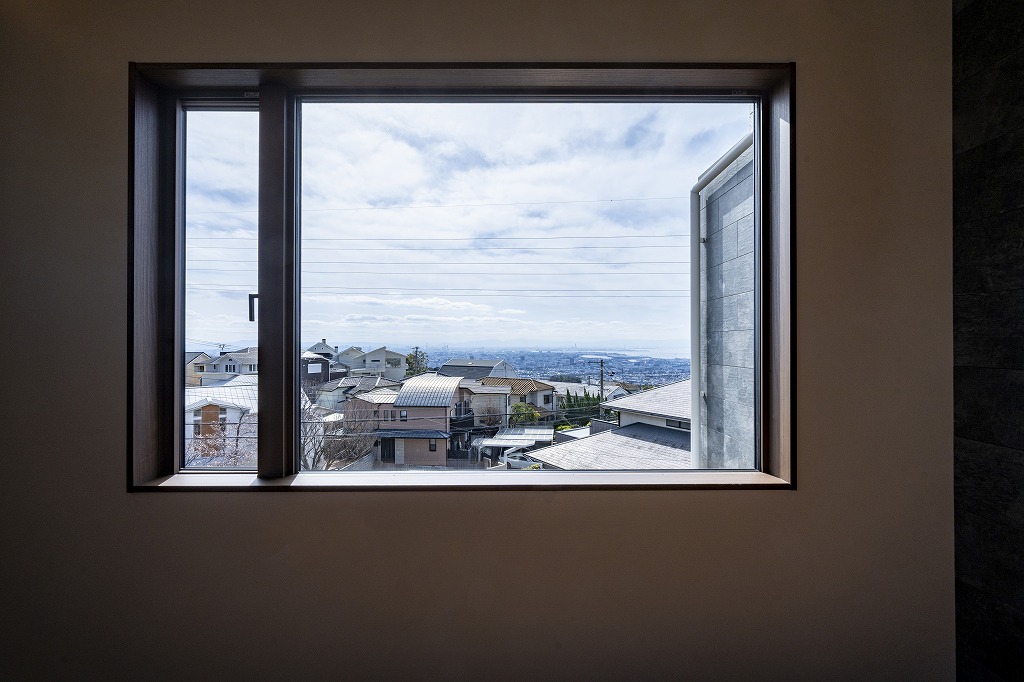 たっぷりの空と街並み、遠く海まで見渡すことができる
