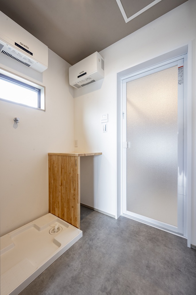 洗濯機と下着などをいれる引出も置けるスペース、そして作業台も備えています