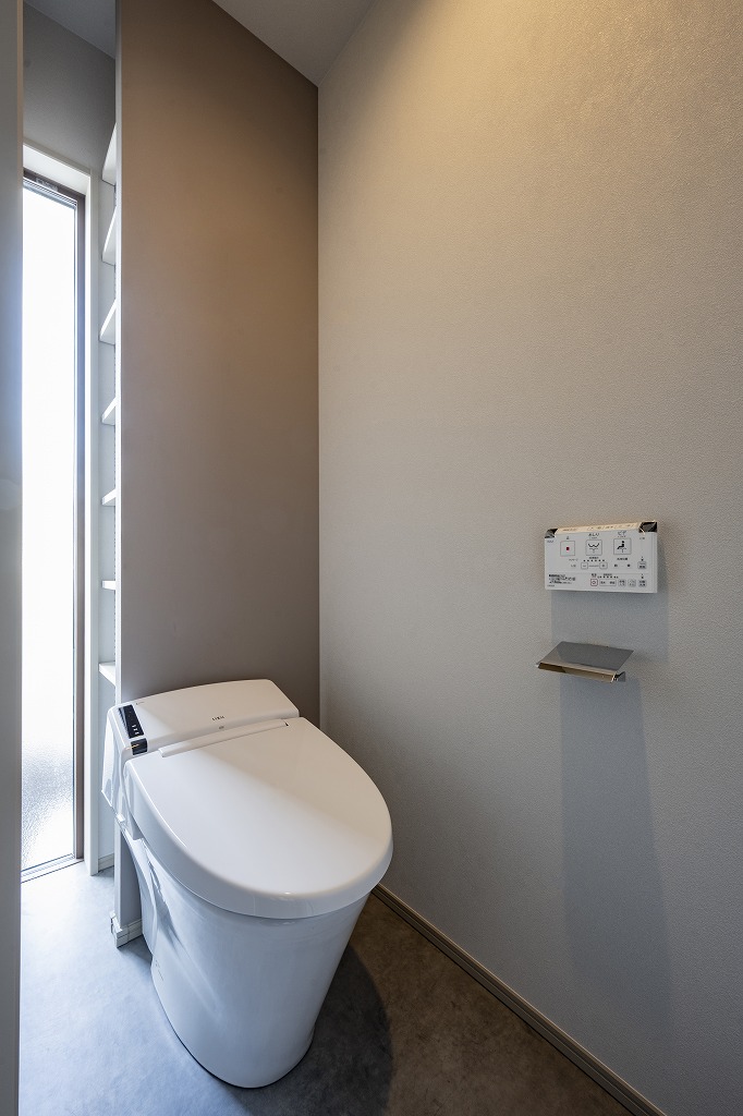 便器の奥の壁に収納を配して、来客から見えづらい造りに