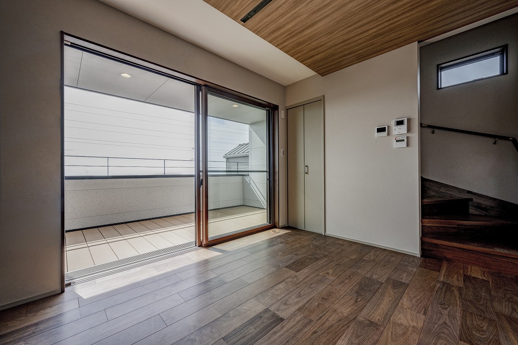 写真右側は、ルーフバルコニーへの階段